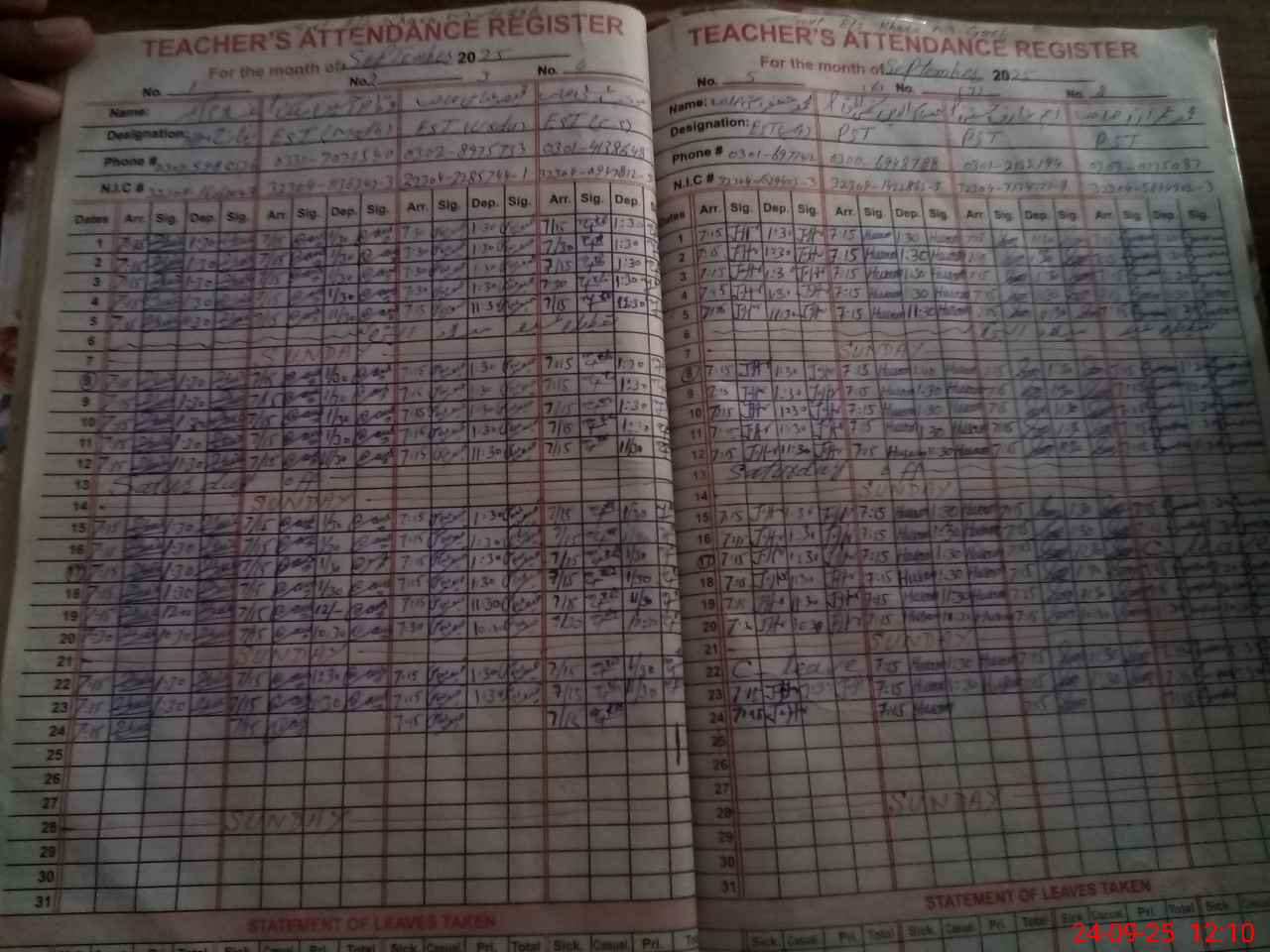| CNIC | Full Name | Designation | R/C | Absence During Last Calender Month |