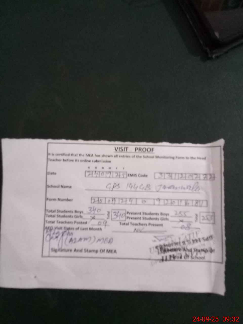 | Attendance Register | Head Teacher | MEA with School | Visit Proof |