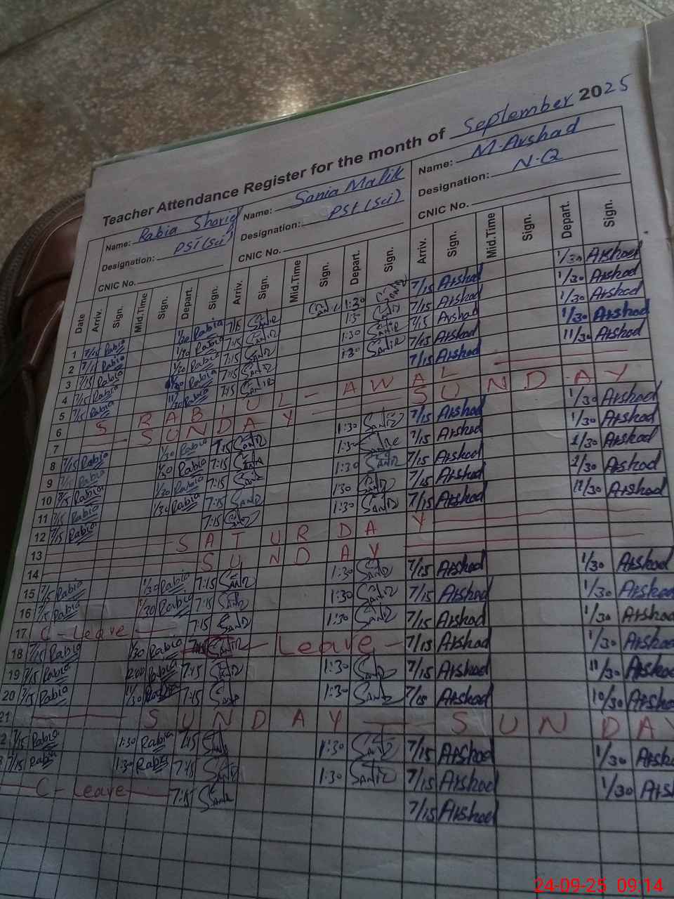 | CNIC | Full Name | Designation | R/C | Absence during last cal. month |