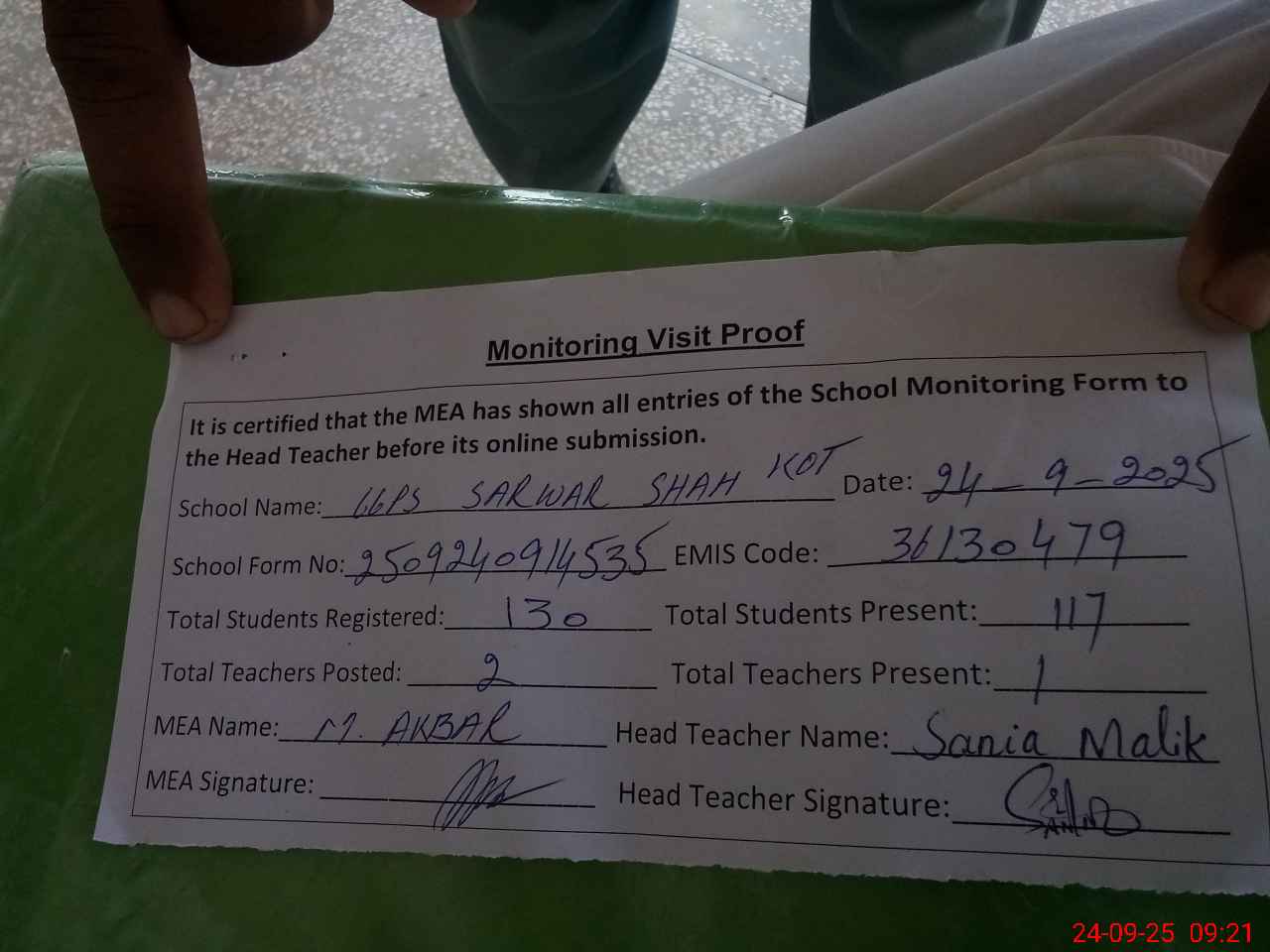 | Attendance Register | Head Teacher | MEA with School | Visit Proof |