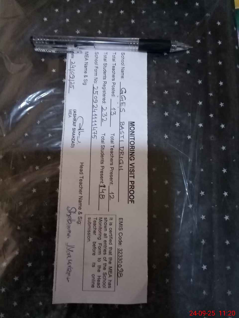 | Attendance Register | Head Teacher | MEA with School | Visit Proof |