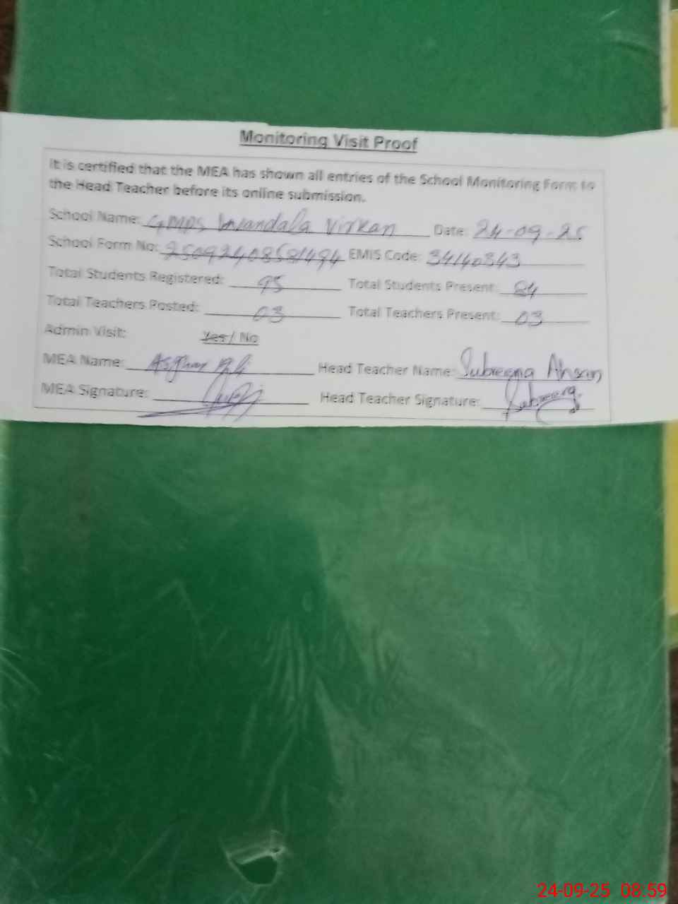 | Attendance Register | Head Teacher | MEA with School | Visit Proof |