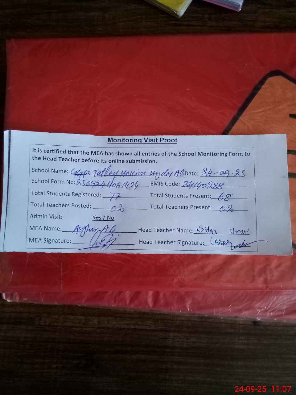 | Attendance Register | Head Teacher | MEA with School | Visit Proof |
