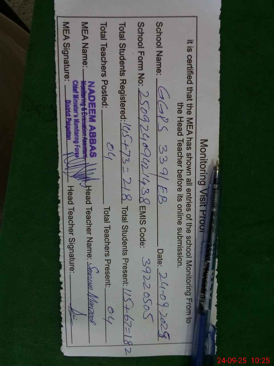 | Certified that this School was Inspected by the Undersigned MEA/DMO Today and the Information Stated Above is as Per Record. | |||||