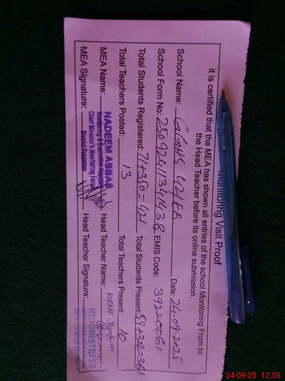 | Certified that this School was Inspected by the Undersigned MEA/DMO Today and the Information Stated Above is as Per Record. | |||||