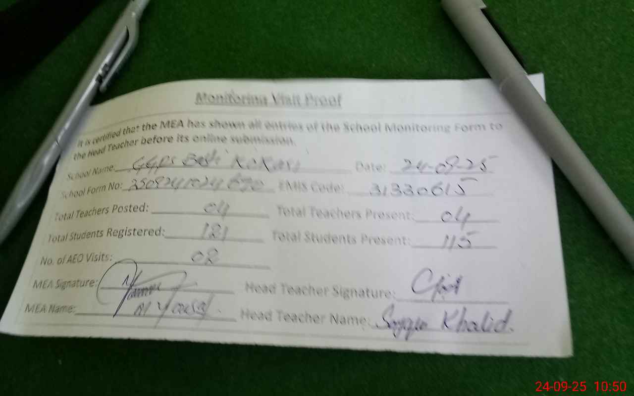 | Attendance Register | Head Teacher | MEA with School | Visit Proof |