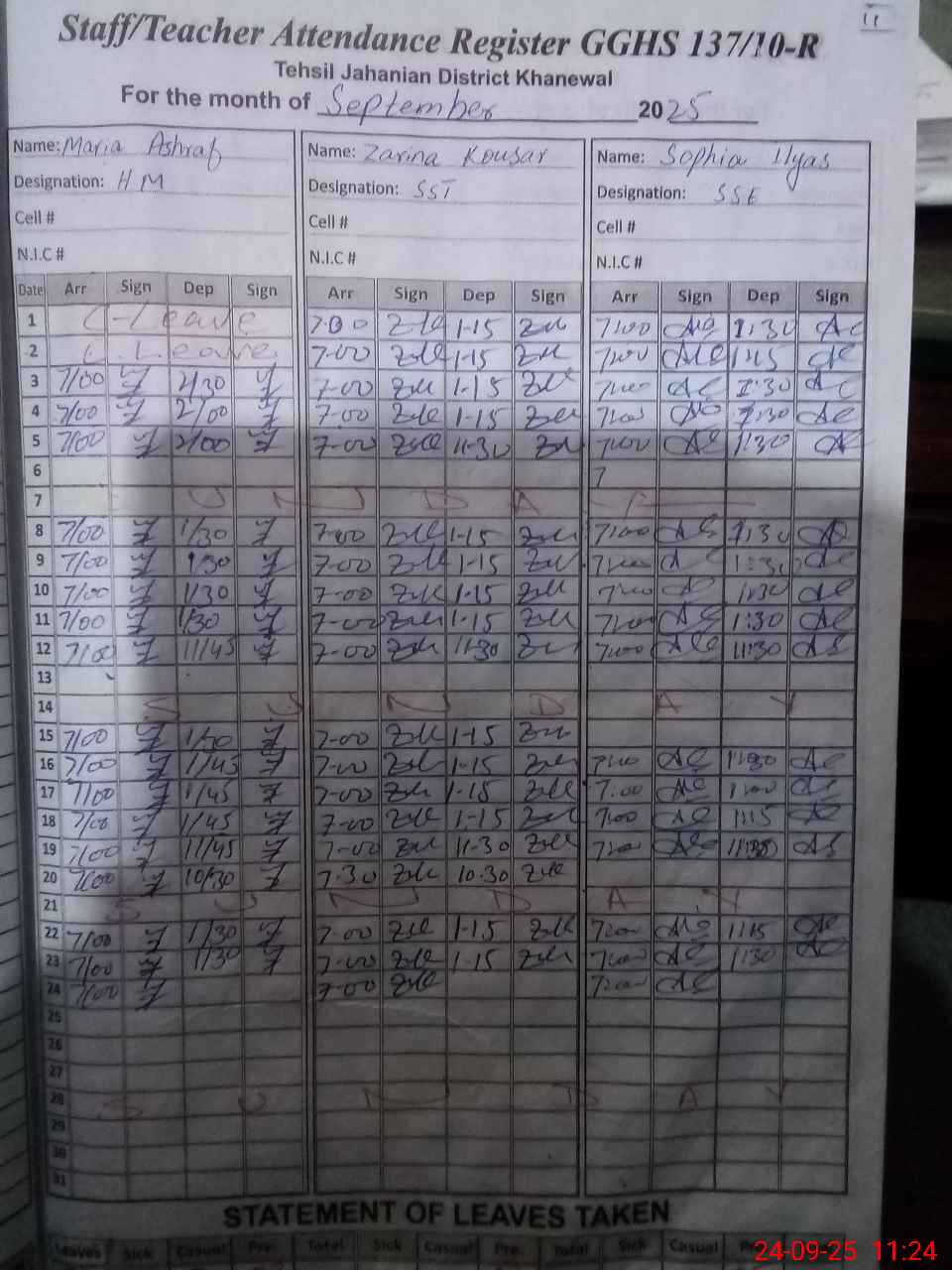 | CNIC | Full Name | Designation | R/C | Absence During Last Calender Month |