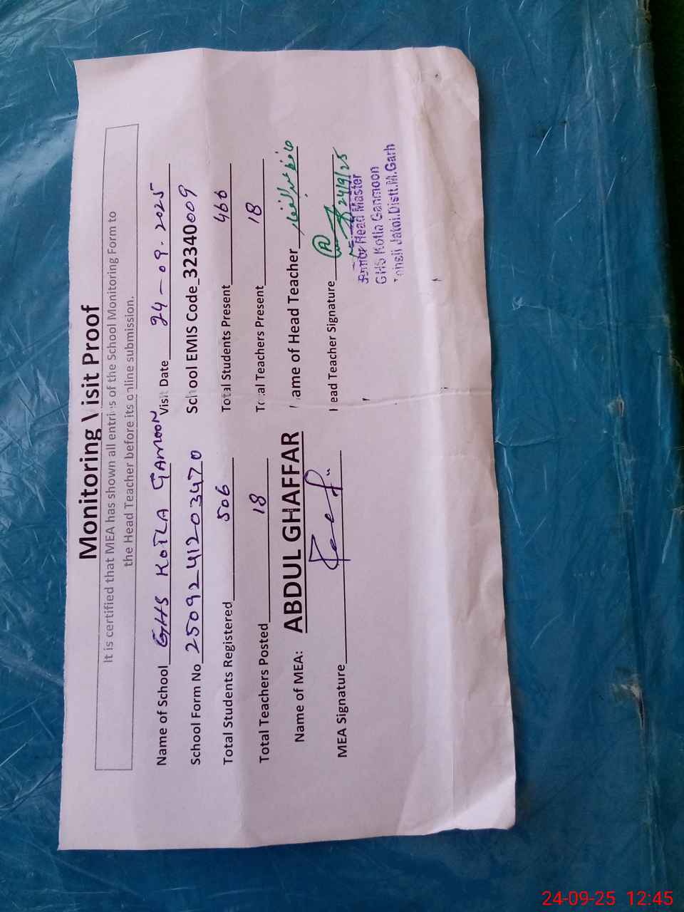 | Attendance Register | Head Teacher | MEA with School | Visit Proof |