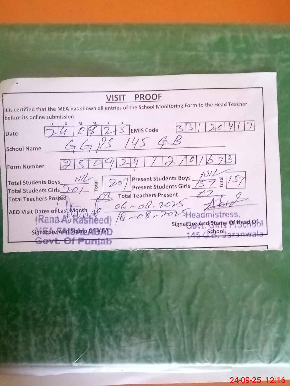 | EMIS Code: 33120417 | Name of School: GGPS CHAK 145 GB JARANWALA | |||