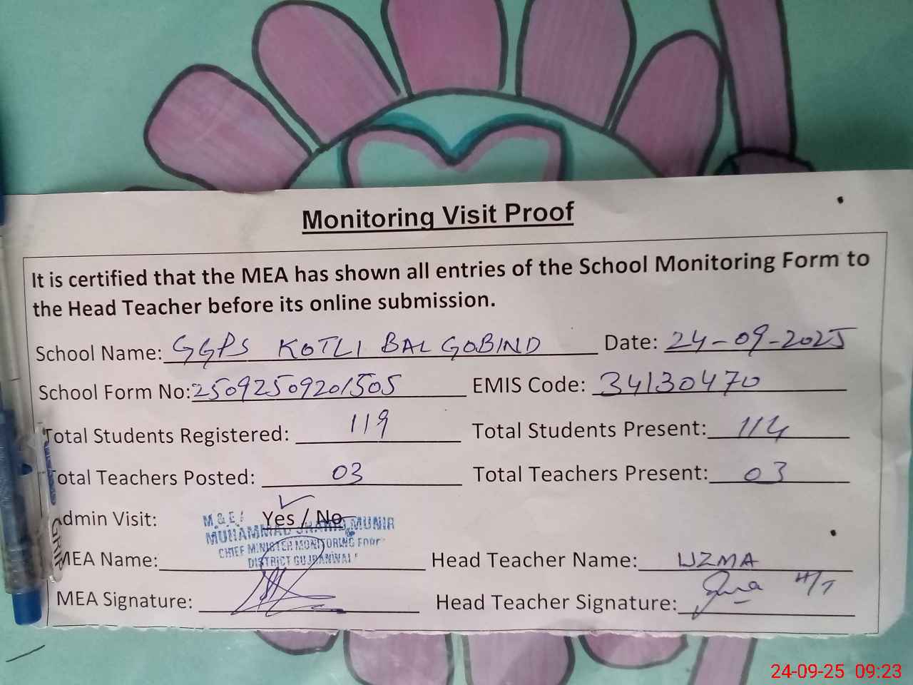 | EMIS Code: 34110470 | Name of School: GGPS KOTLI BAL GOBIND | |||