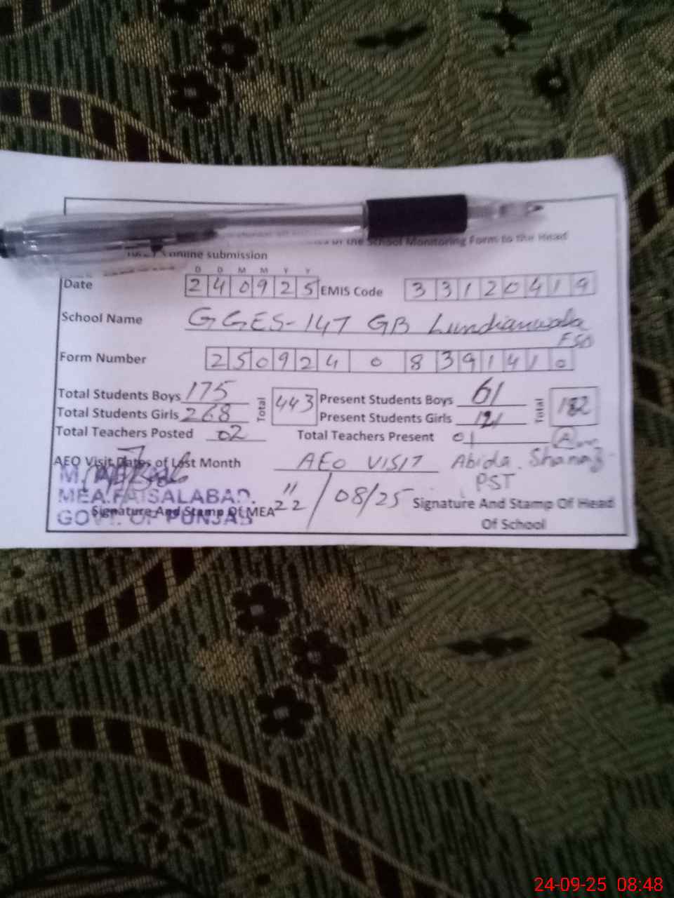 | Certified that this School was Inspected by the Undersigned MEA/DMO Today and the Information Stated Above is as Per Record. | |||||