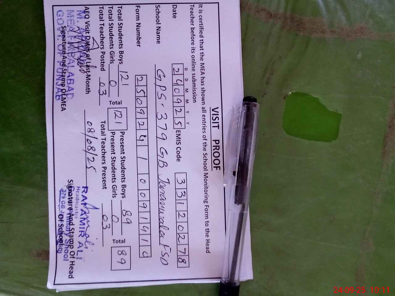 | Attendance Register | Head Teacher | MEA with School | Visit Proof |