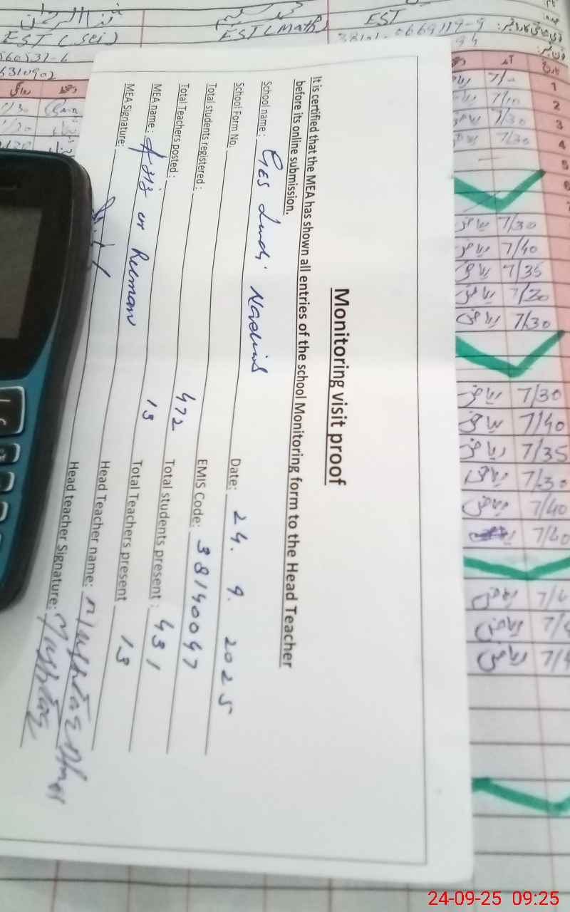 | Attendance Register | Head Teacher | MEA with School | Visit Proof |