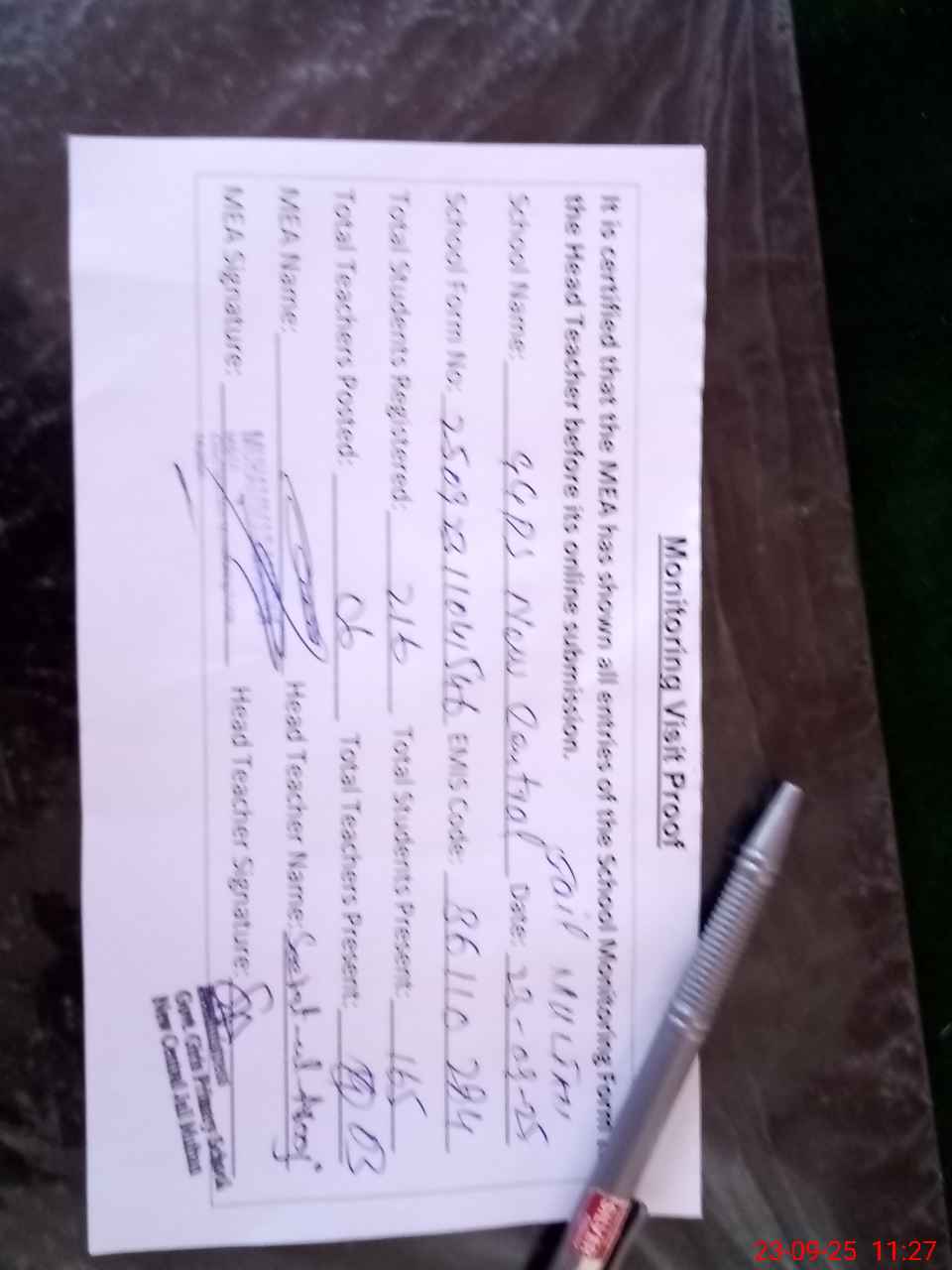 | Attendance Register | Head Teacher | MEA with School | Visit Proof |