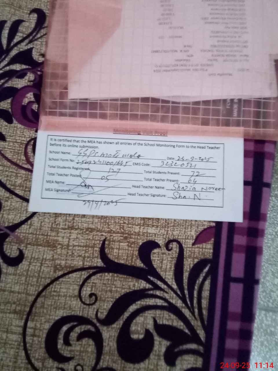 | Attendance Register | Head Teacher | MEA with School | Visit Proof |