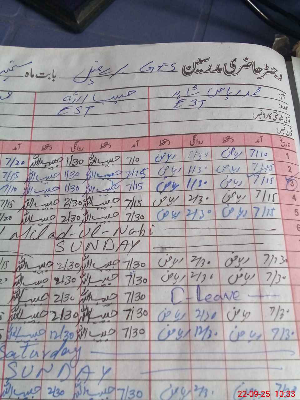 | CNIC | Full Name | Designation | R/C | Absence During Last Calender Month |