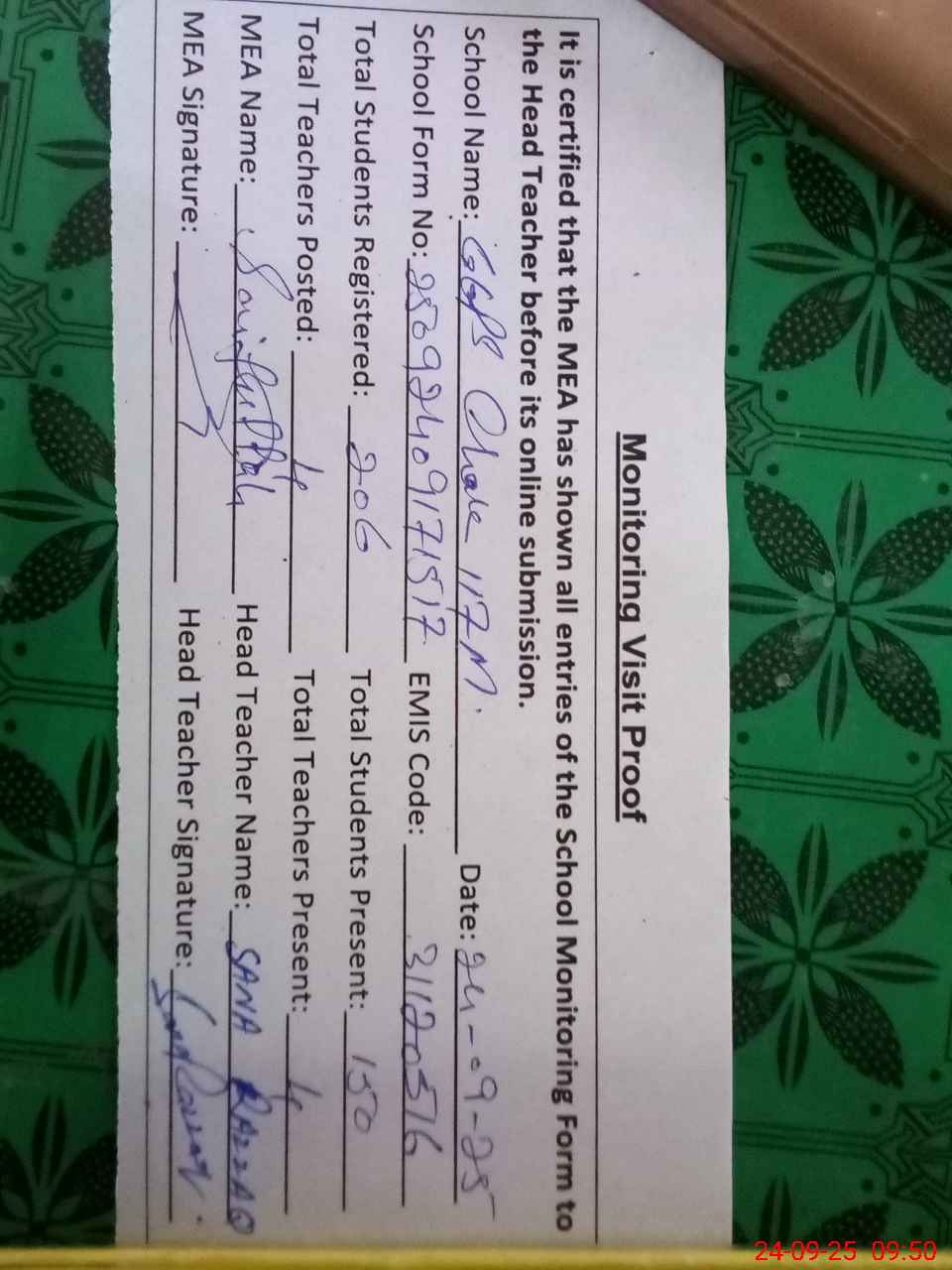 | EMIS Code: 31120516 | Name of School: GGPS CHAK NO. 117 MURAD | |||