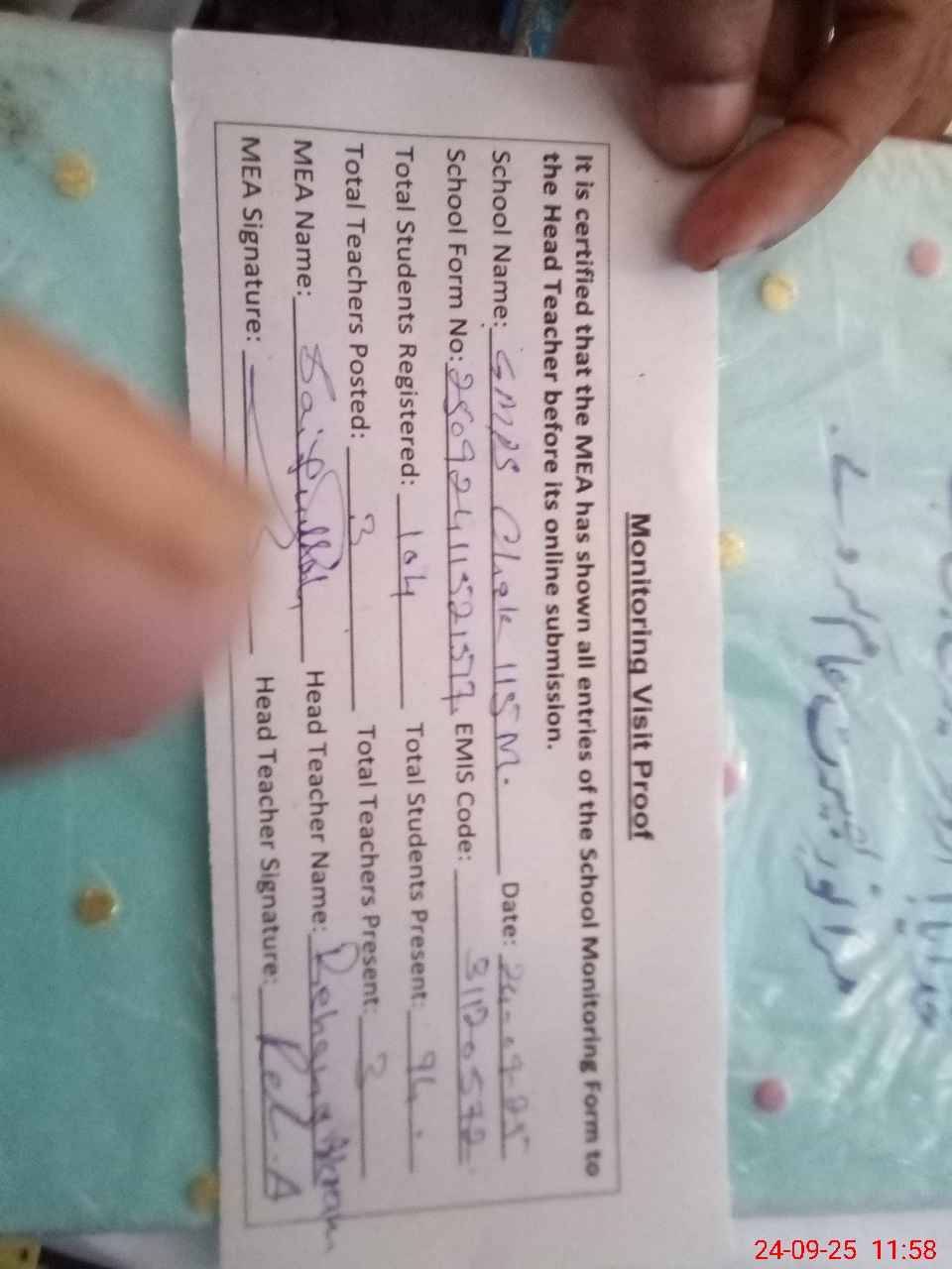 | Attendance Register | Head Teacher | MEA with School | Visit Proof |