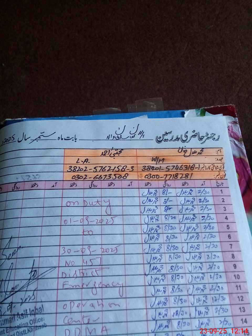 | CNIC | Full Name | Designation | R/C | Absence During Last Calender Month |