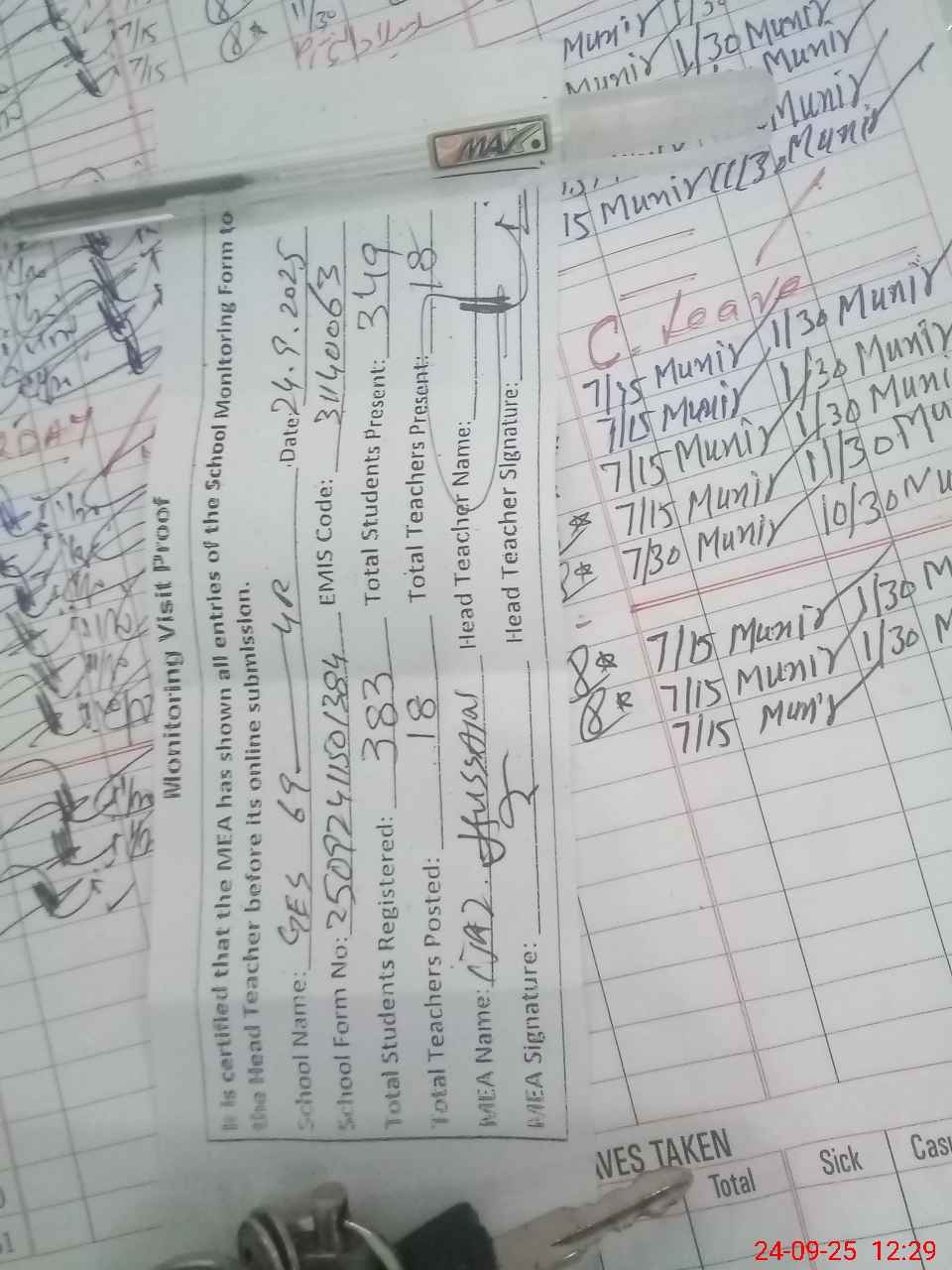 | Attendance Register | Head Teacher | MEA with School | Visit Proof |