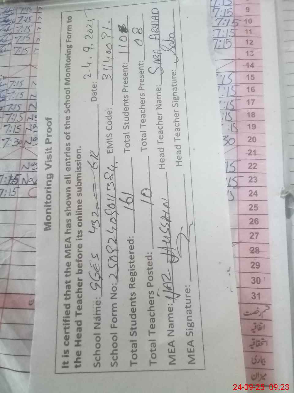 | Attendance Register | Head Teacher | MEA with School | Visit Proof |