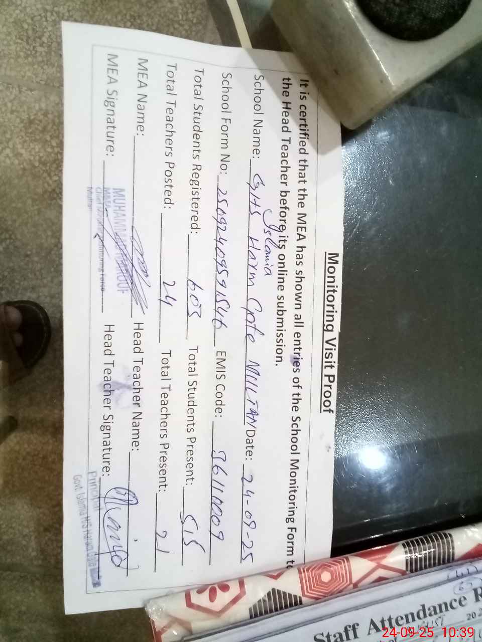| Attendance Register | Head Teacher | MEA with School | Visit Proof |