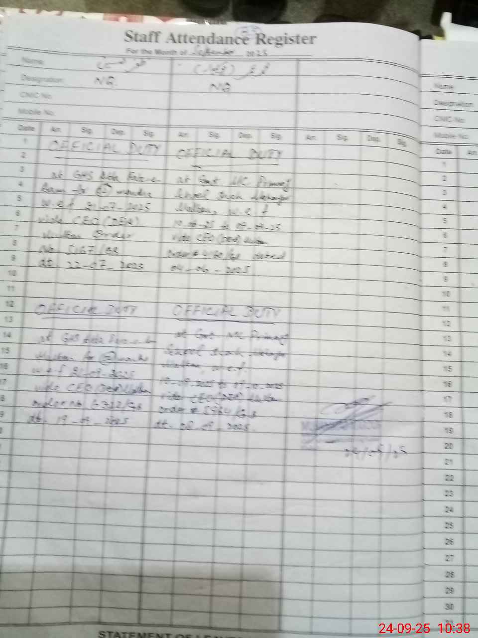 | CNIC | Full Name | Designation | R/C | Absence During Last Calender Month |