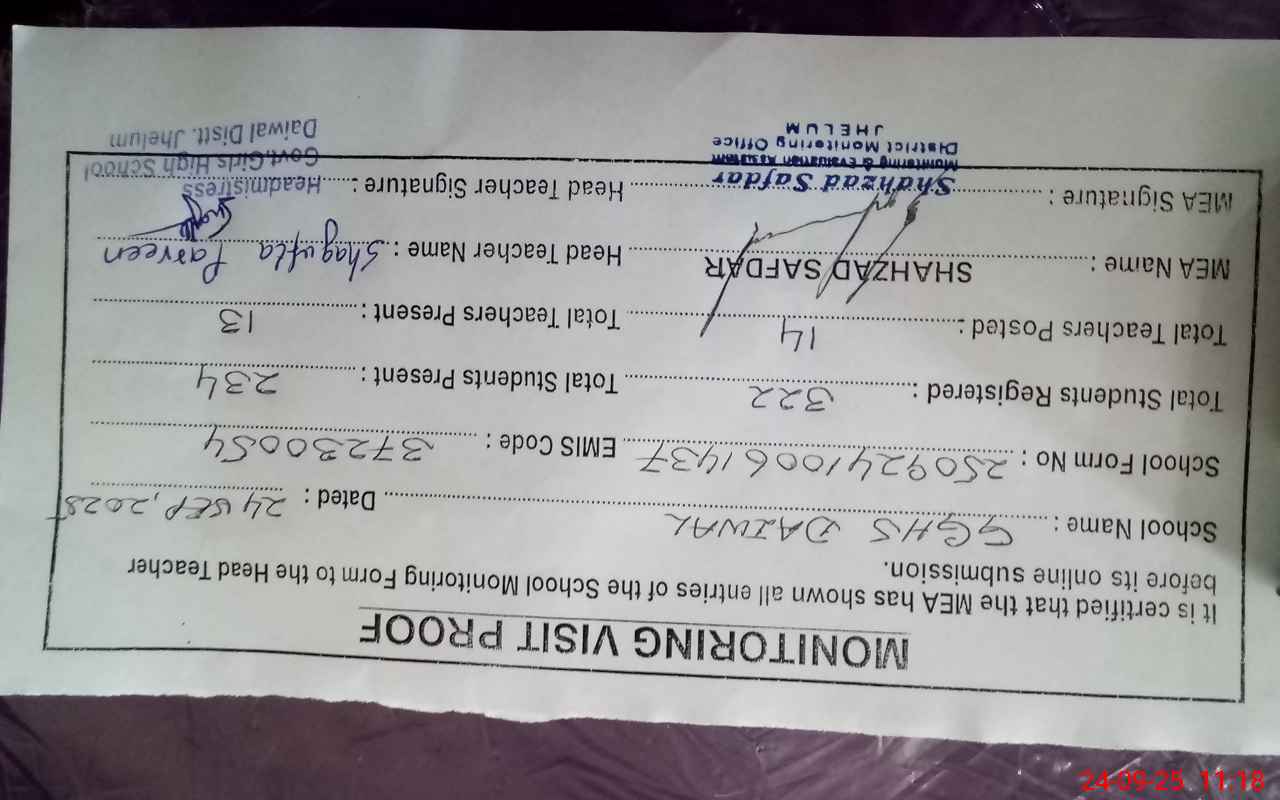 | EMIS Code: 37230054 | Name of School: GGHS DAIWAL | |||