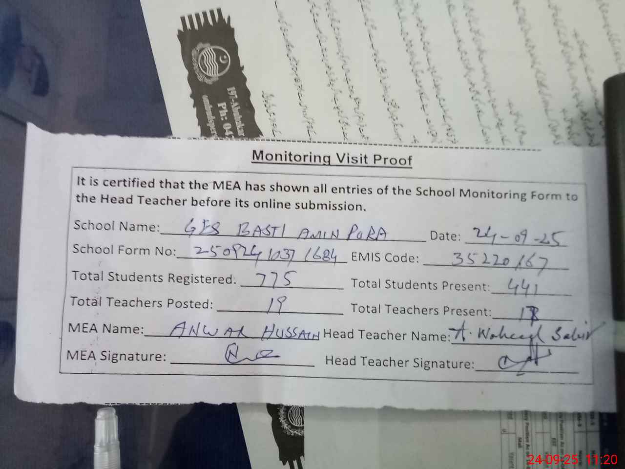 | Attendance Register | Head Teacher | MEA with School | Visit Proof |
