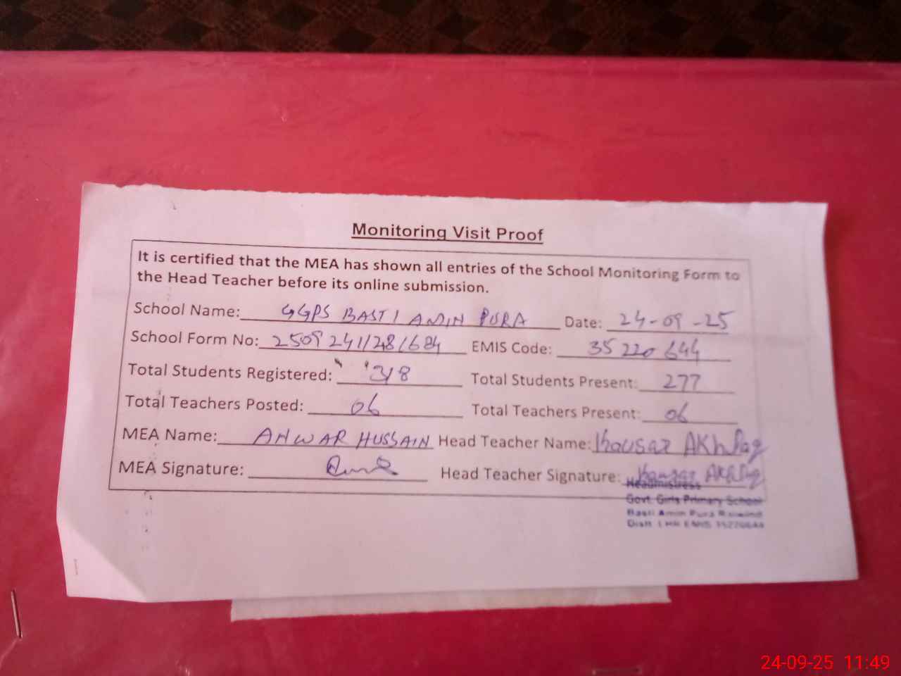 | Attendance Register | Head Teacher | MEA with School | Visit Proof |
