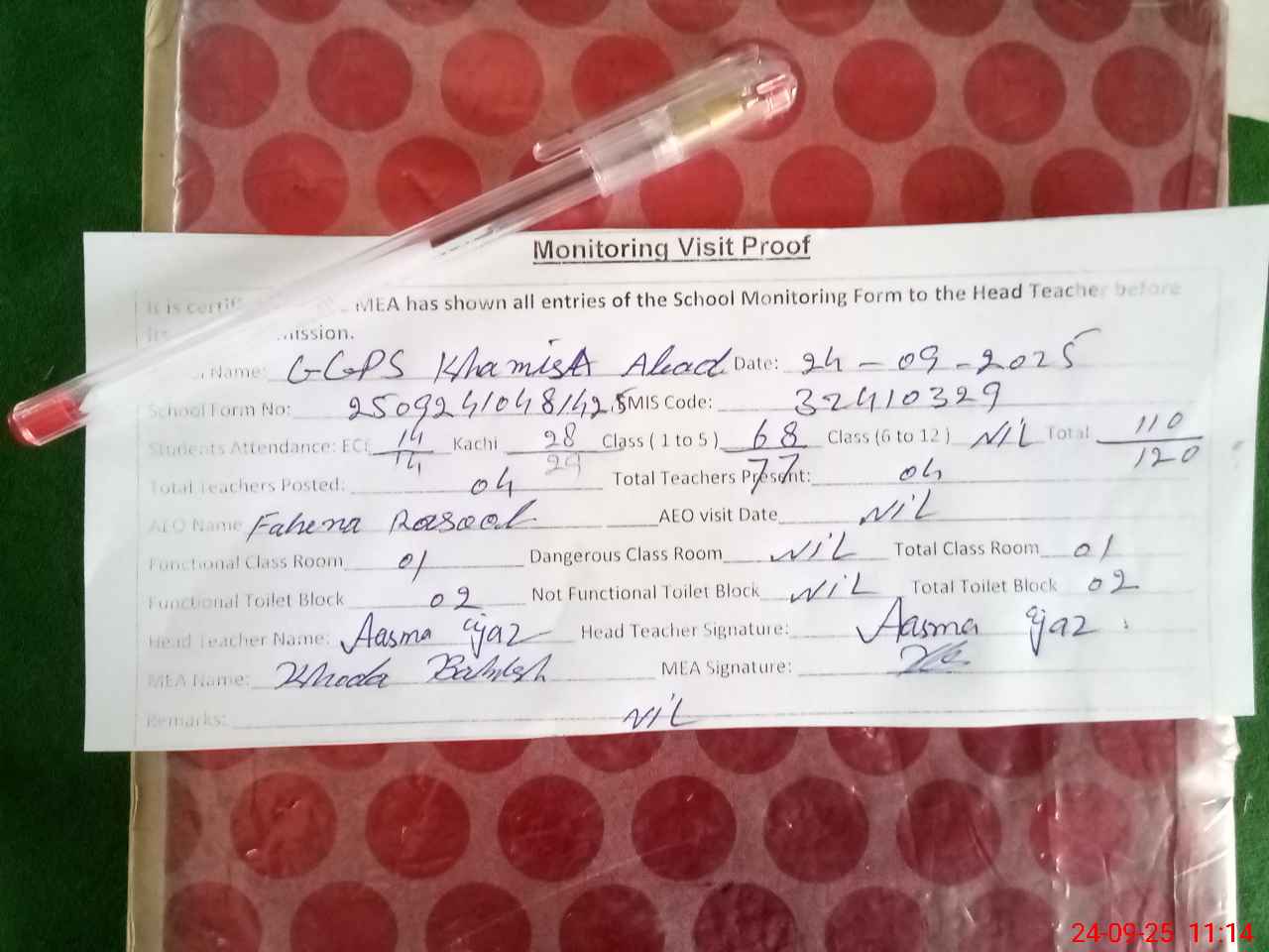 | Attendance Register | Head Teacher | MEA with School | Visit Proof |