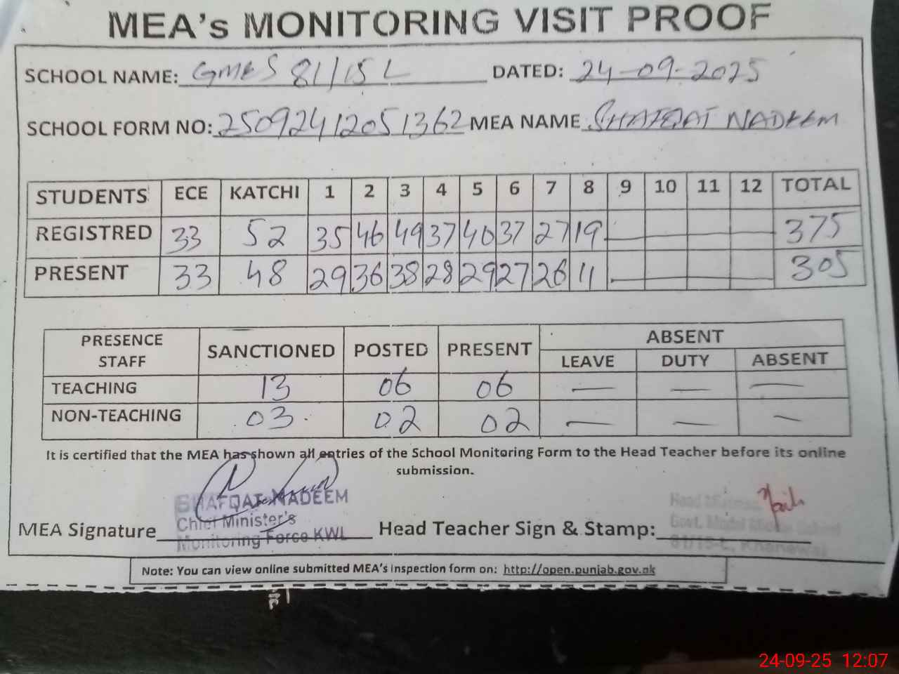 | Attendance Register | Head Teacher | MEA with School | Visit Proof |