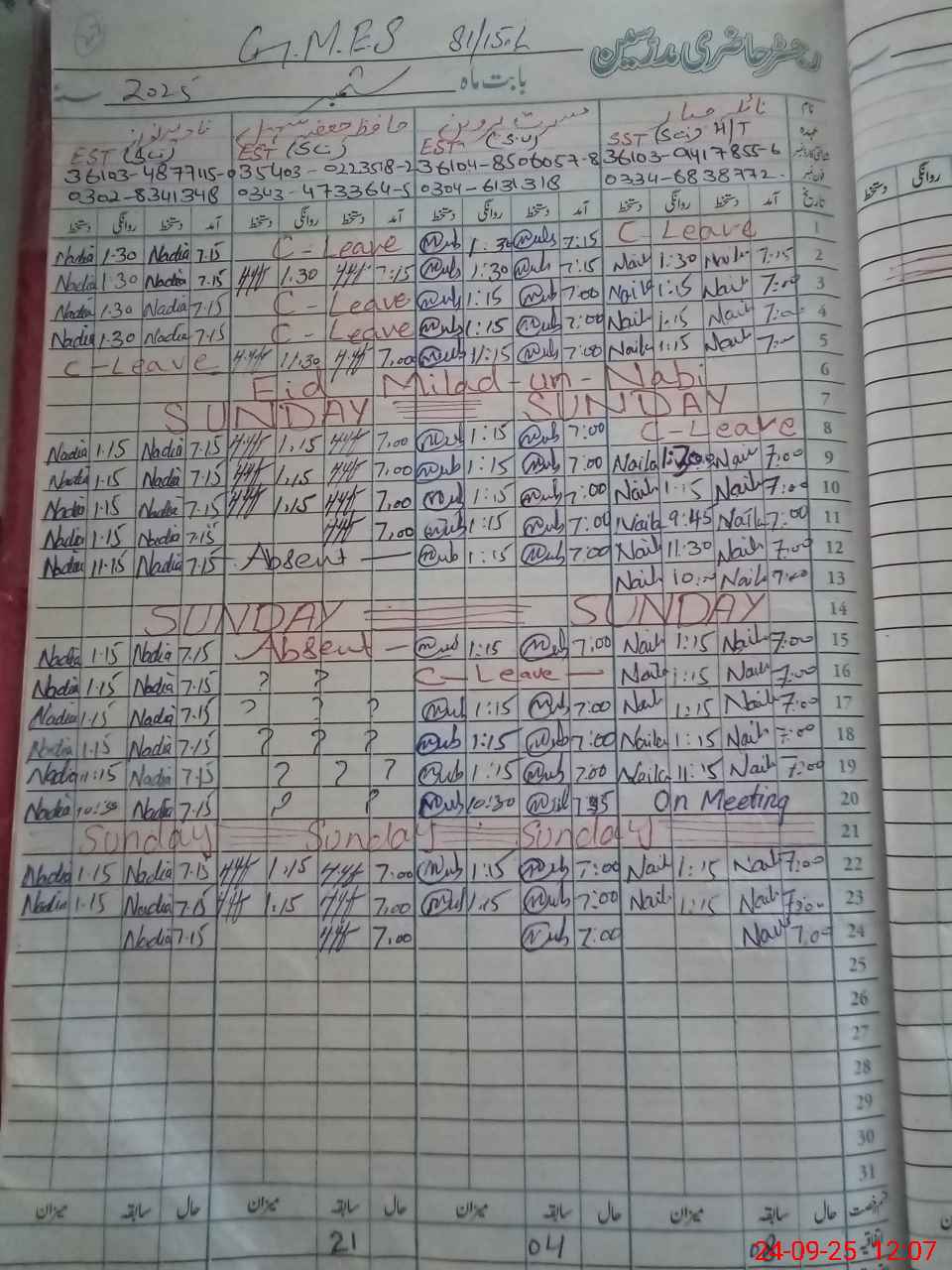 | CNIC | Full Name | Designation | R/C | Absence During Last Calender Month |