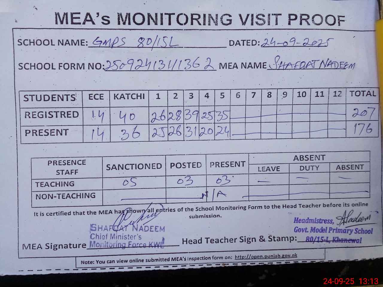 | Attendance Register | Head Teacher | MEA with School | Visit Proof |