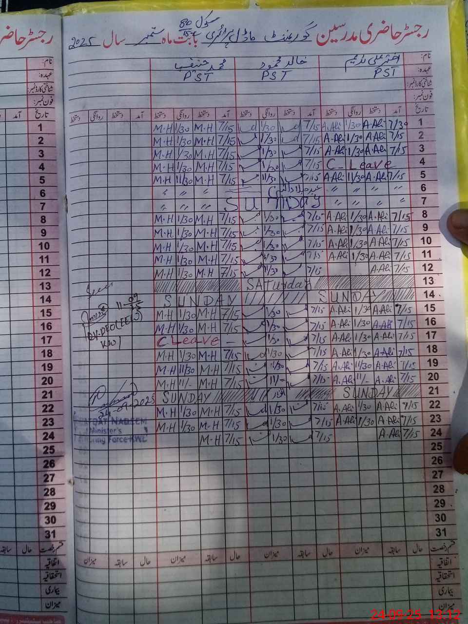 | CNIC | Full Name | Designation | R/C | Absence During Last Calender Month |