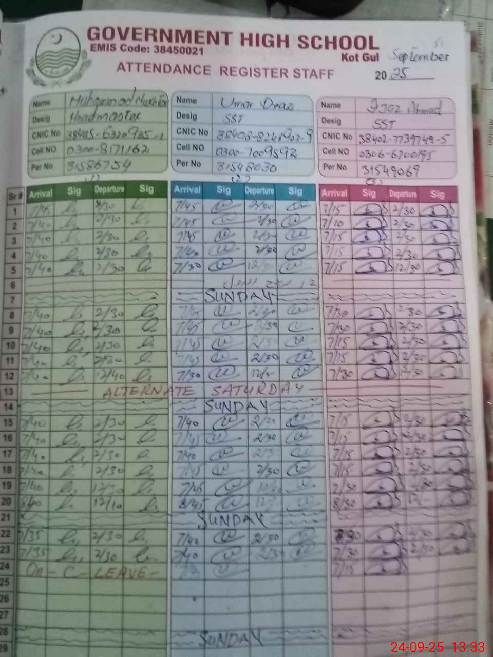 | CNIC | Full Name | Designation | R/C | Absence during last cal. month |