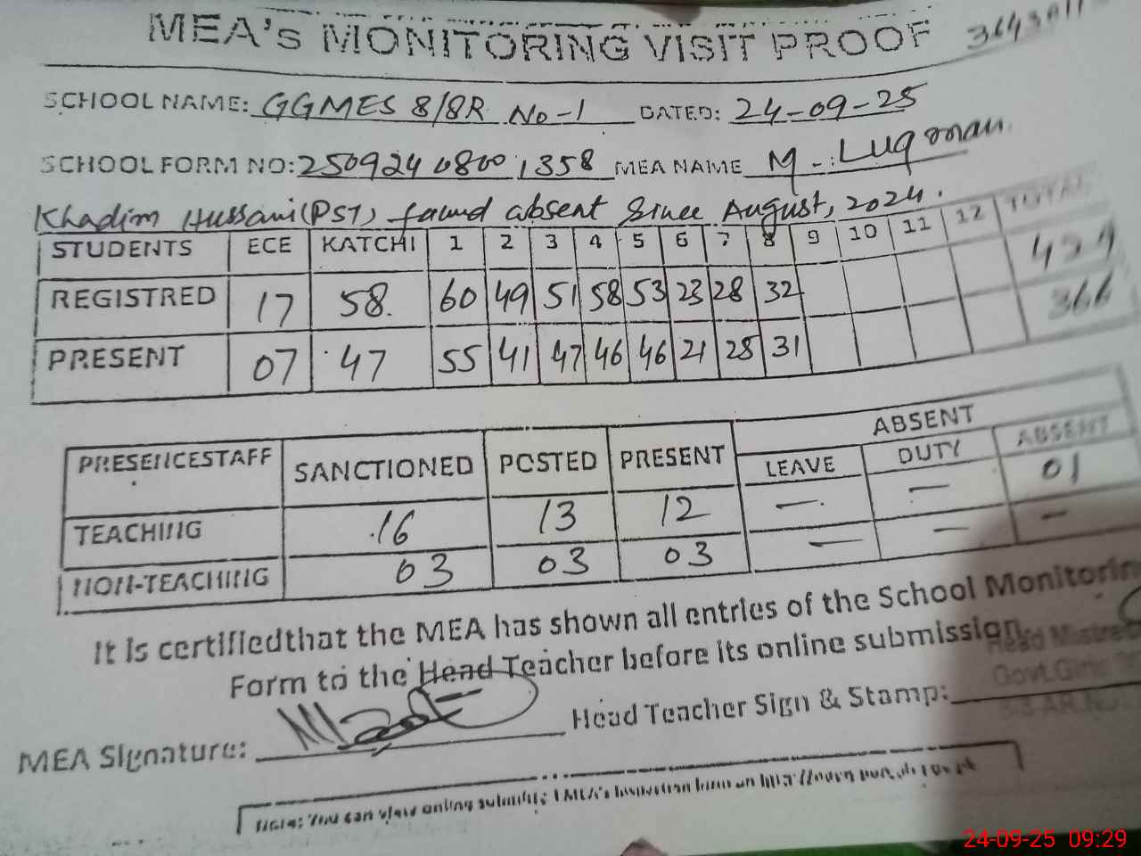| Attendance Register | Head Teacher | MEA with School | Visit Proof |