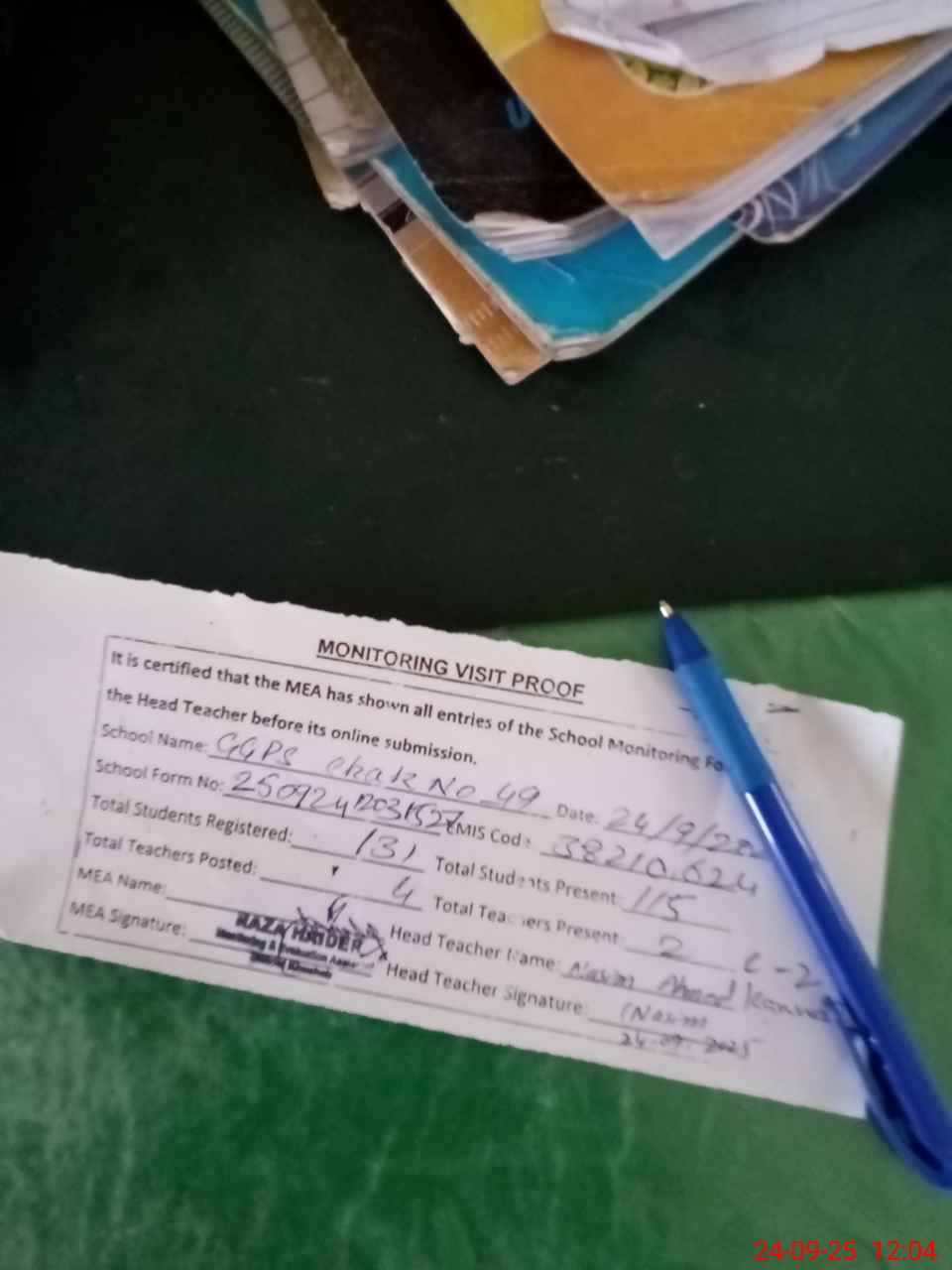 | Attendance Register | Head Teacher | MEA with School | Visit Proof |
