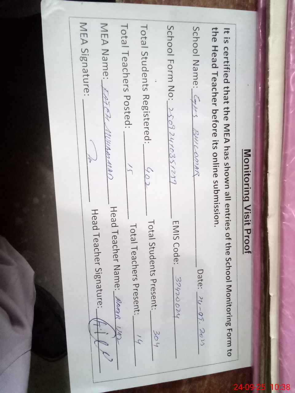 | Attendance Register | Head Teacher | MEA with School | Visit Proof |