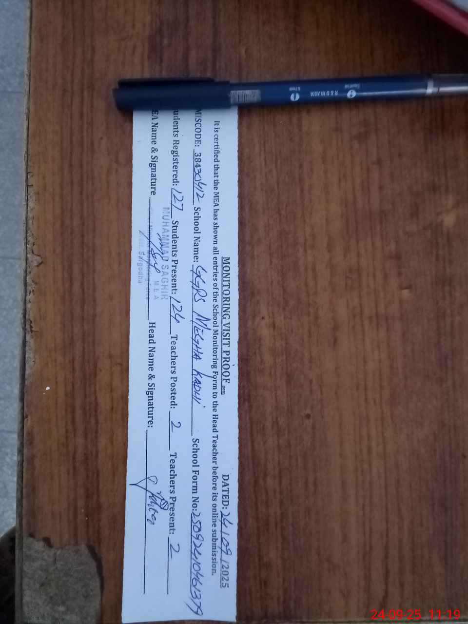 | Attendance Register | Head Teacher | MEA with School | Visit Proof |