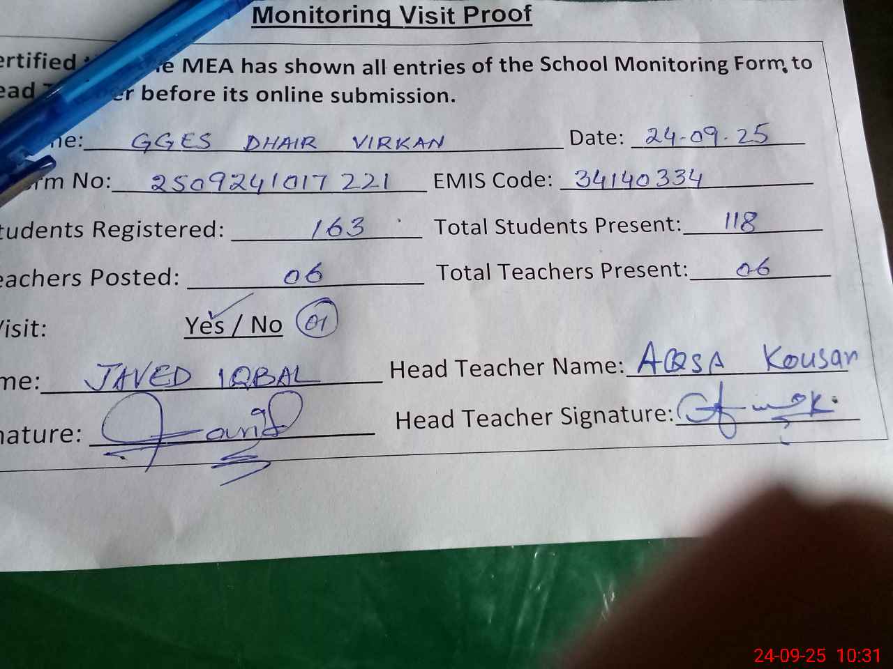 | Attendance Register | Head Teacher | MEA with School | Visit Proof |