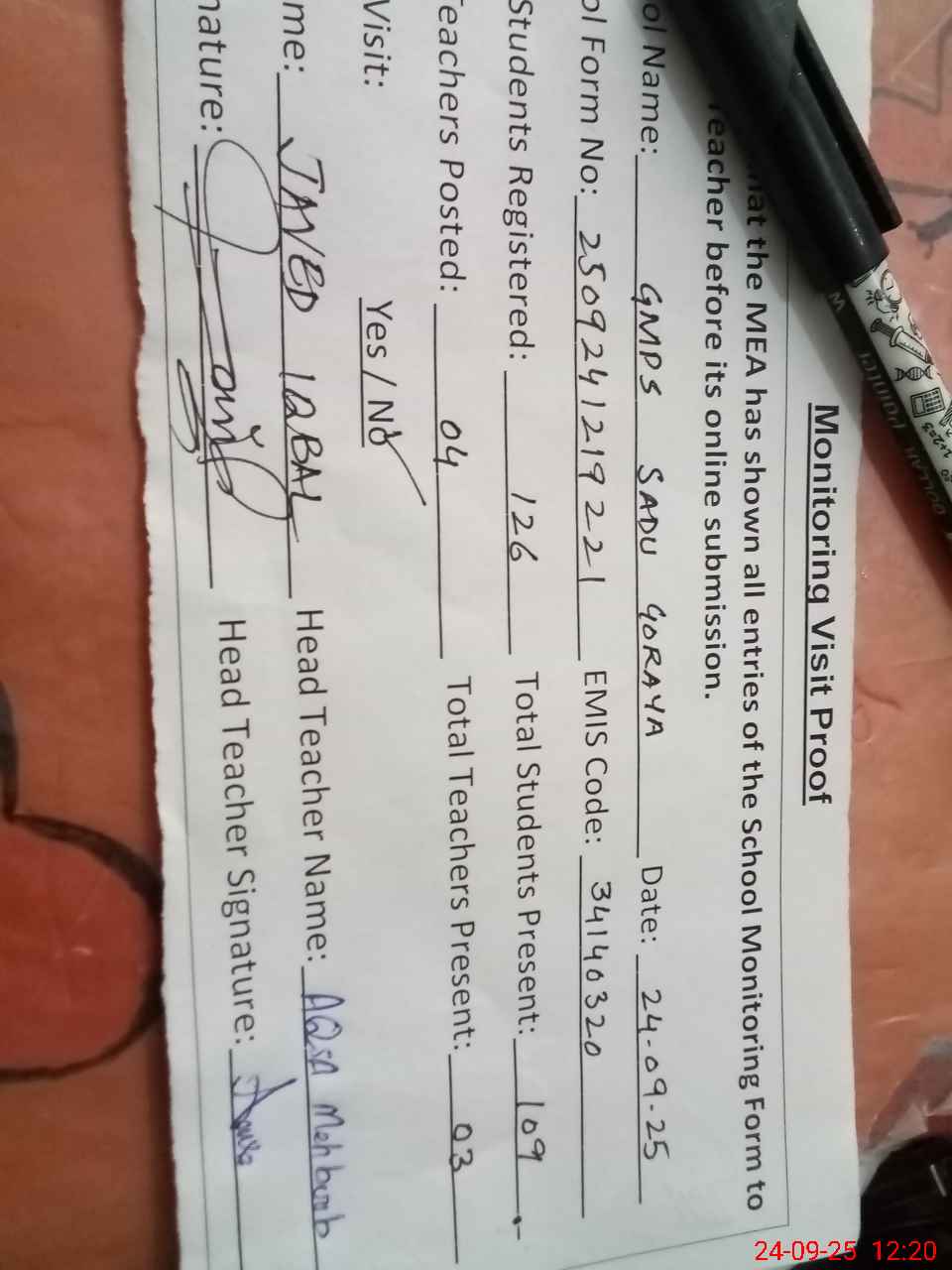 | Attendance Register | Head Teacher | MEA with School | Visit Proof |