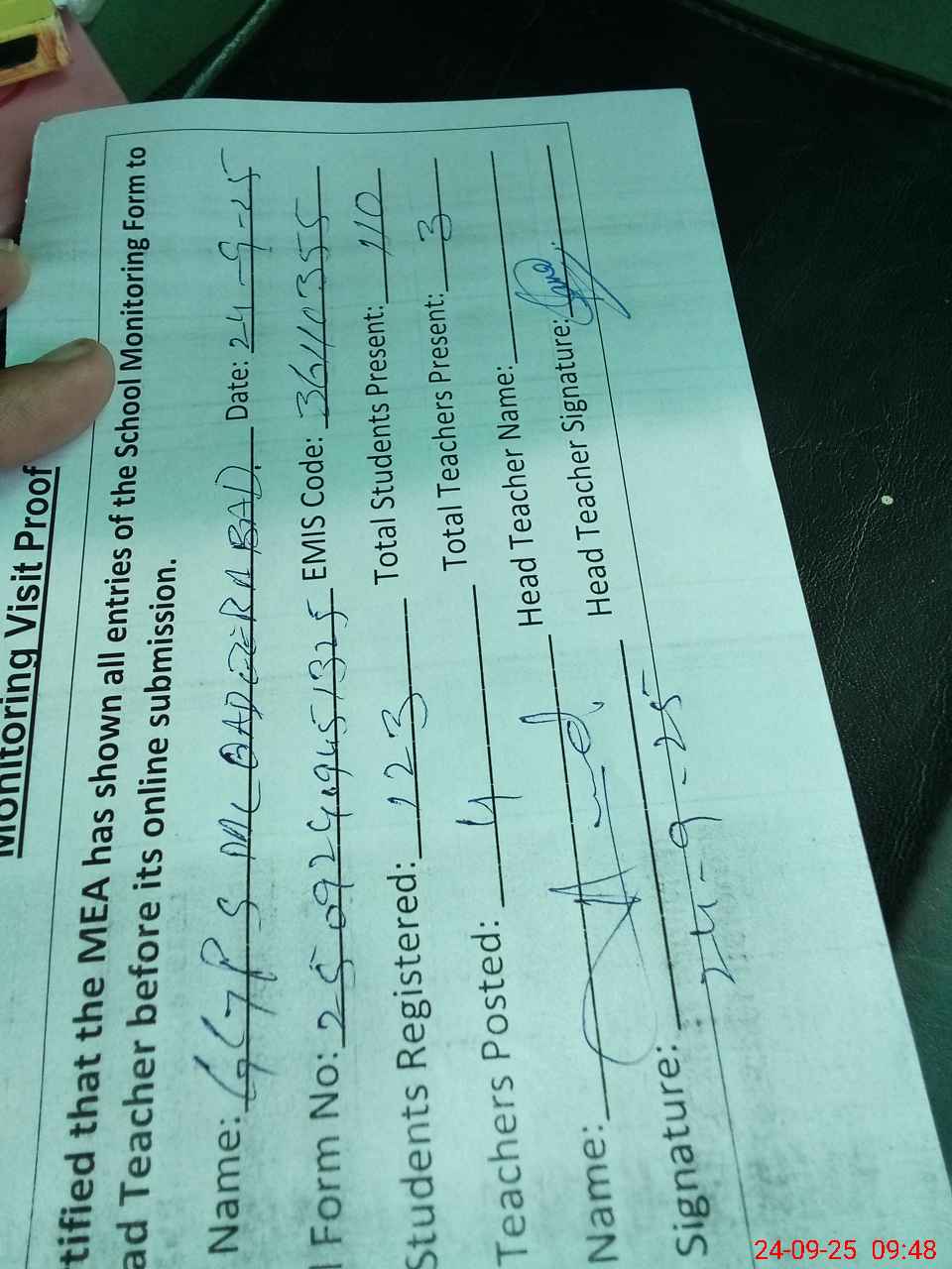 | Attendance Register | Head Teacher | MEA with School | Visit Proof |