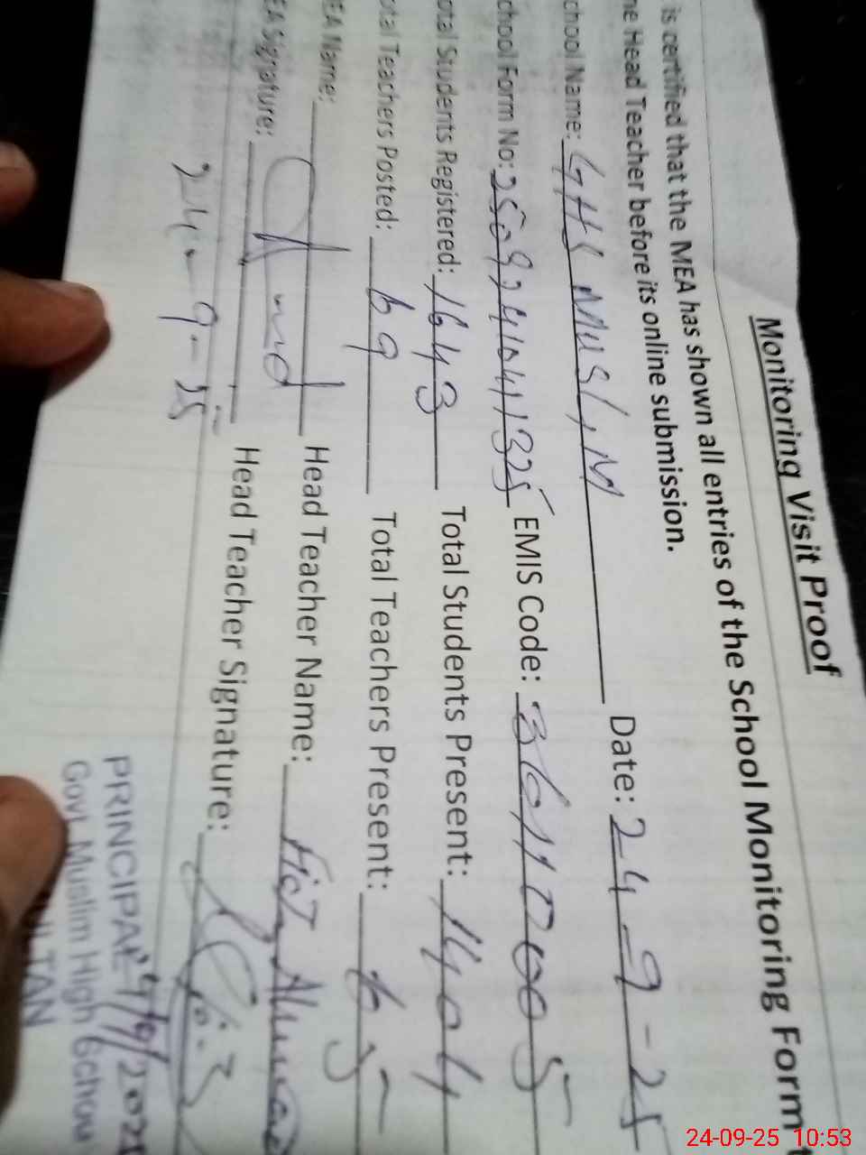 | Certified that this School was Inspected by the Undersigned MEA/DMO Today and the Information Stated Above is as Per Record. | |||||