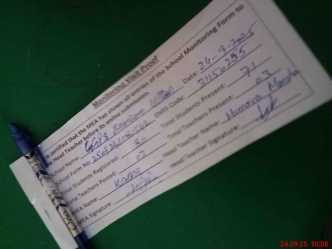 | Attendance Register | Head Teacher | MEA with School | Visit Proof |