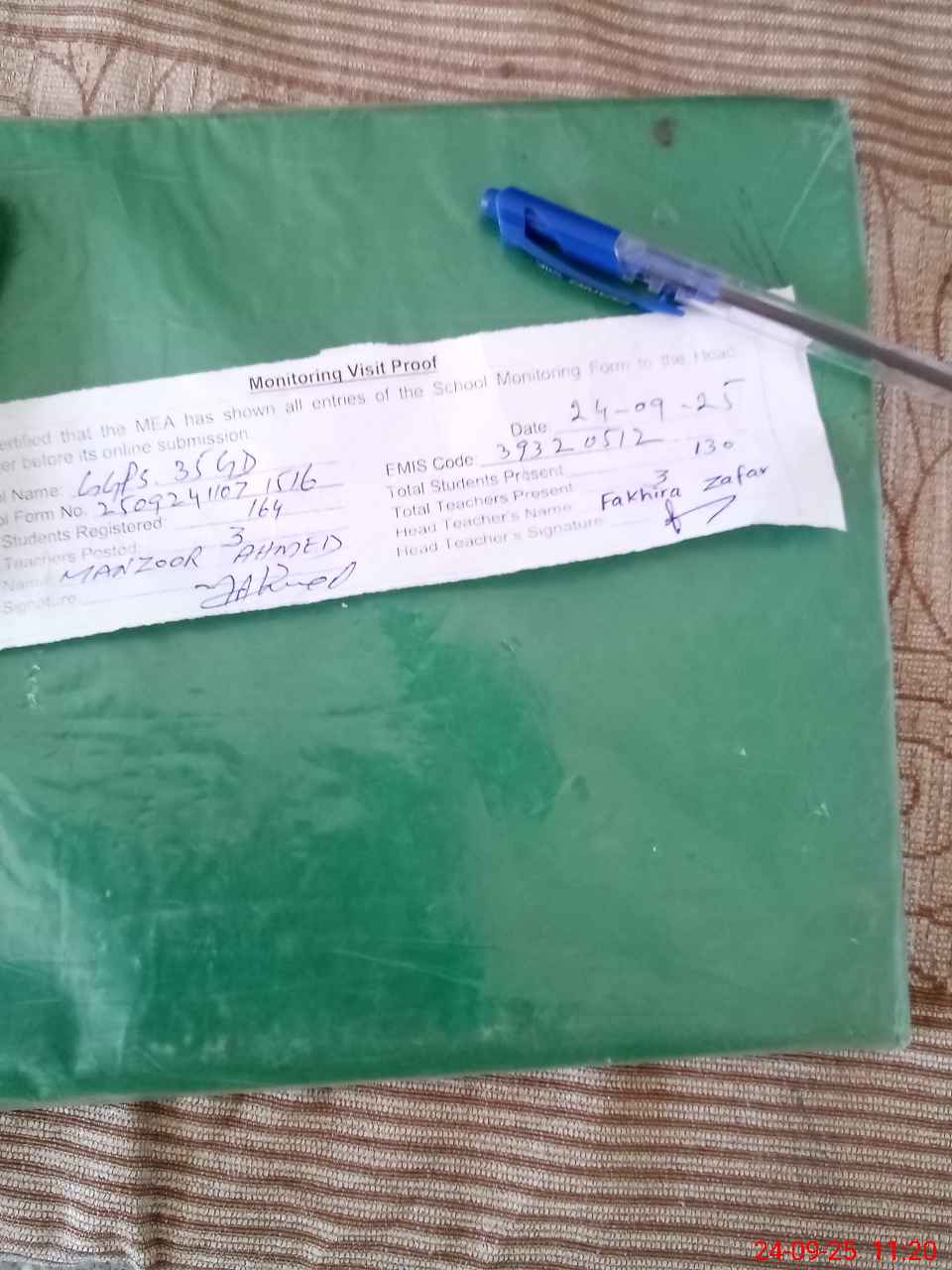 | Attendance Register | Head Teacher | MEA with School | Visit Proof |