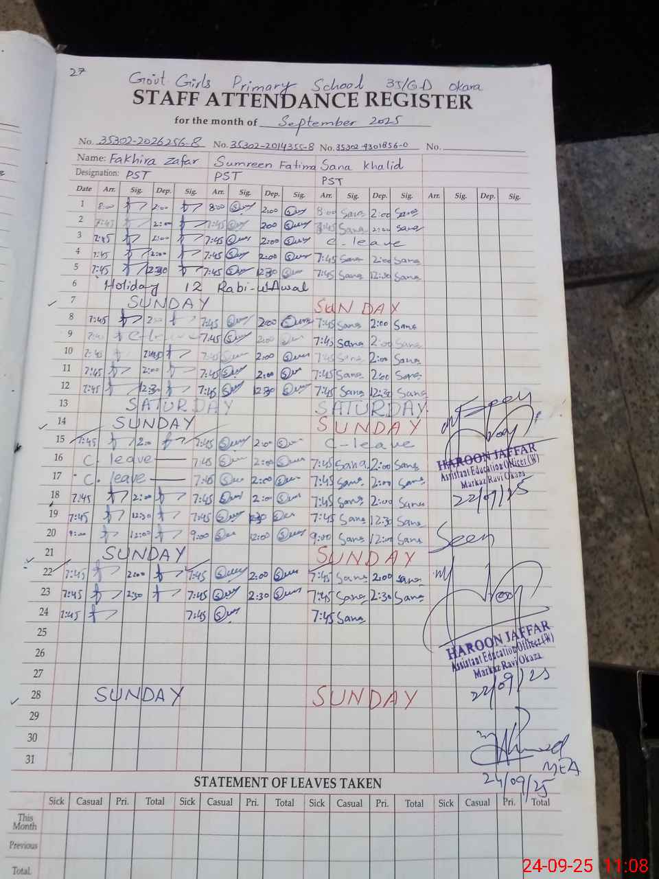 | CNIC | Full Name | Designation | R/C | Absence During Last Calender Month |
