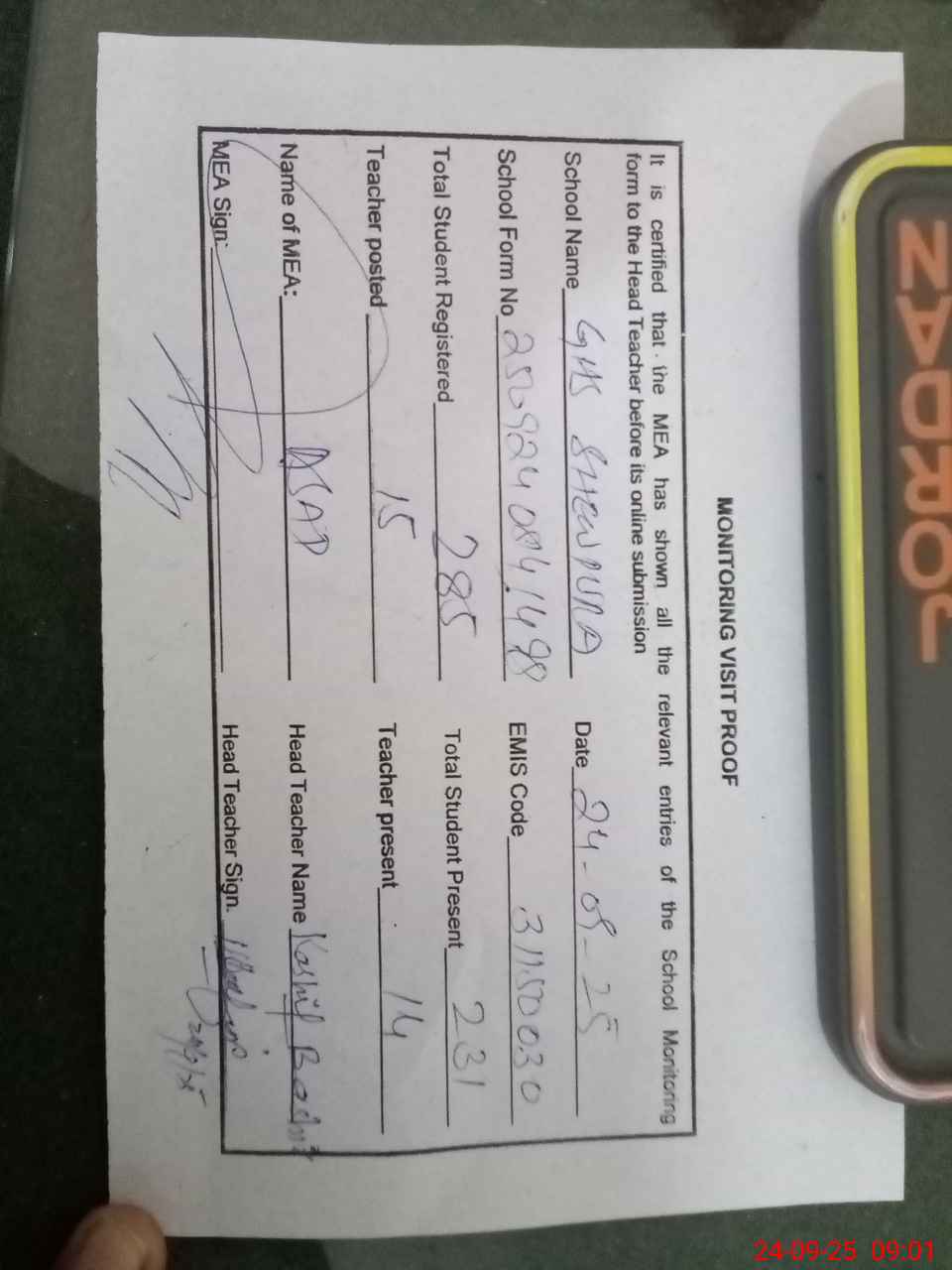 | Attendance Register | Head Teacher | MEA with School | Visit Proof |