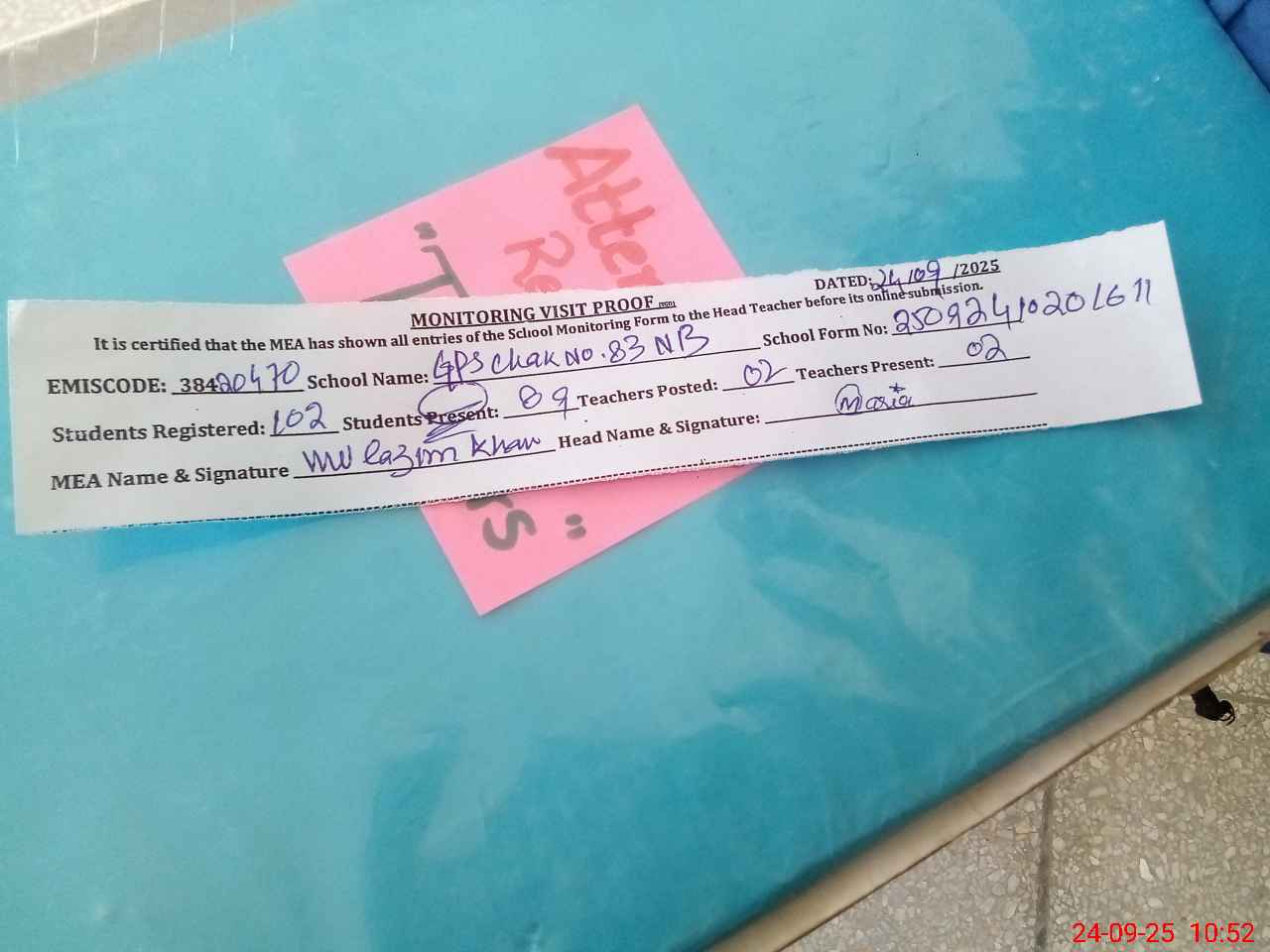 | Attendance Register | Head Teacher | MEA with School | Visit Proof |