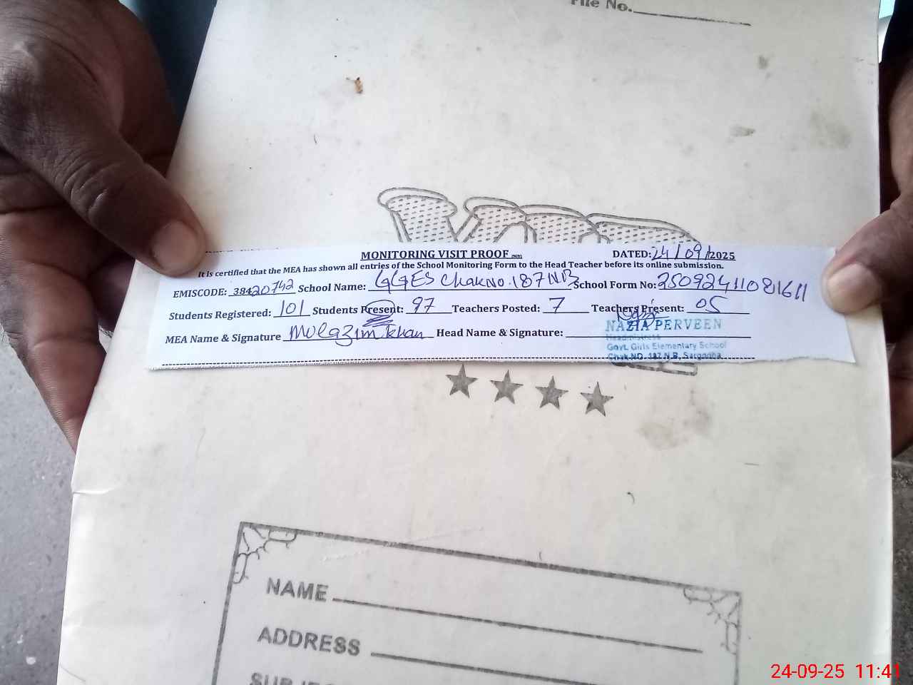 | Attendance Register | Head Teacher | MEA with School | Visit Proof |